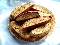6 eggs Crush up anise seeds add a little water and mix well. In a large bowl. Put eggs, sugar, fruit, oil, anise seeds, extract and almonds. Mix well. Sift flour and baking powder and add to mixture. Mix well, add more flour if needed until dough is firm enough to roll. Divide into to portions and roll out round about 8-12 inches long and a 1/2 inch thick. Place on greased cookie sheet and bake at 375 degrees for 20-30 minutes. Take out of oven, and slice diagonally into 1 inch slices. Put back in oven and bake until lightly brown turning once. Remove and cool on cookie rack.