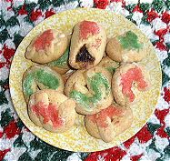 Now, if you have a meat grinder, its best. Don't make the mistake I did once and use my blender to do this. Not a good idea! I smoke checked it. But a food processor should do the trick. You may also put the figs in some water, and stew them for a few minutes to soften them. Chop nuts up fine in a nut chopper. Put a 1/2 cup of sherry and other ingredients into food processor a little at a time, and grind up (no need to add sherry during grinding if you use a meat chopper, you can add that later when you mix in the nuts). Remove from processor and put in large bowl, add nuts and mix well. Add more sherry as needed as to not have mixture too dry. A medium to dry consistency is what your looking for. Now put in a covered plastic container, and store in refrigerator. Can be stored for up to a year. Add a tsp. of sherry to mixture once a month to keep it fermented. Now use this filling for the Italian cookies. Just flatten a small piece of dough and put a tsp. of filling on it and fold sides up and pinch closed. Bake the same as for the plain cookies. And decorate or leave plain.