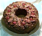 1 1/2 lb candied fruit mix Mix fruit, dates, nuts, honey and wine. In another bowl, cream butter and gradually cream in sugar, then beat in eggs one at a time, beating each one very thoroughly. Transfer creamed butter and sugar to large bowl and add fruits. Then sift in dry ingrediants. Mix all together very thoroughly. In a spring pan with hole in center, butter and line all sides and bottom including the round part of center with wax paper. Bake in slow oven at 275 degrees for about 2-2 1/2 hours with a pan of water on oven floor. When done, remove from pan to cool but leave paper on cake. Store in a airtight can lined with tin foil, making sure to place a piece of tin foil over top of cake. Once a week till Christmas, pour a jigger of Sherry on top and in the middle hole of cake. After Christmas adding once a month will do. Makes a 5 lb cake.